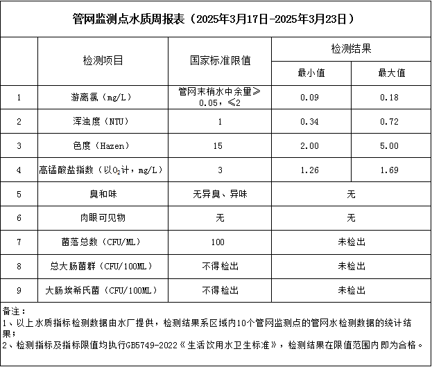管網(wǎng)監(jiān)測點(diǎn)水質(zhì)周報(bào)表(2025年3月17日-2025年3月23日)