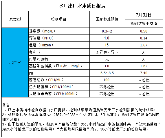 水廠出廠水水質(zhì)日?qǐng)?bào)表(2025-7-31)