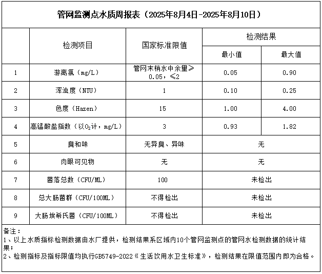 管網(wǎng)監(jiān)測(cè)點(diǎn)水質(zhì)周報(bào)表(2025年8月4日-2025年8月10日)