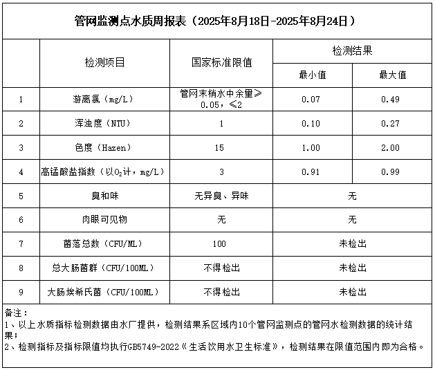 管網(wǎng)監(jiān)測點水質(zhì)周報表(2025年8月18日-2025年8月24日)