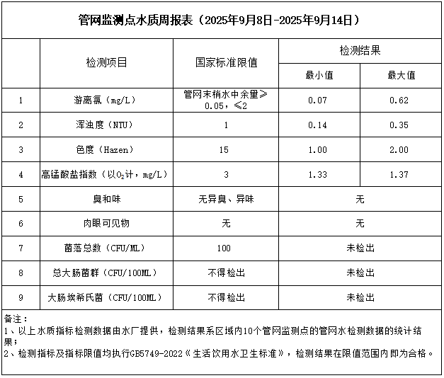管網(wǎng)監(jiān)測(cè)點(diǎn)水質(zhì)周報(bào)表(2025年9月8日-2025年9月14日)