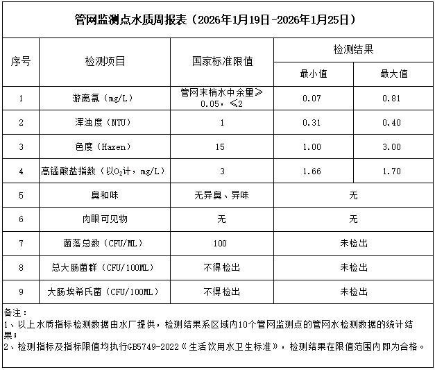 管網(wǎng)監(jiān)測點水質周報表(2026年1月19日-2026年1月25日)