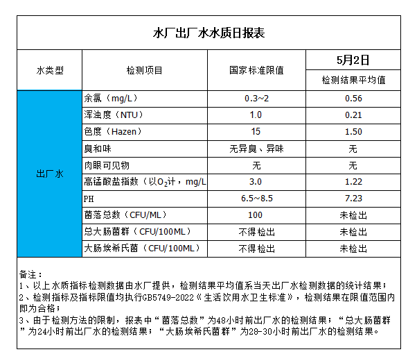 水廠出廠水水質(zhì)日?qǐng)?bào)表(2023-5-2)