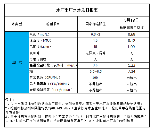 水廠出廠水水質(zhì)日報表(2023-5-18)