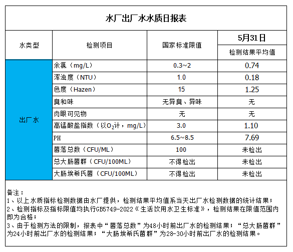 水廠出廠水水質(zhì)日?qǐng)?bào)表(2023-5-31)