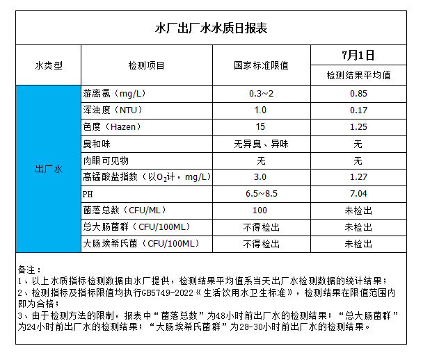 水廠出廠水水質(zhì)日報表(2023-7-1)
