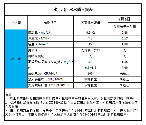 水廠出廠水水質(zhì)日?qǐng)?bào)表(2023-7-4)