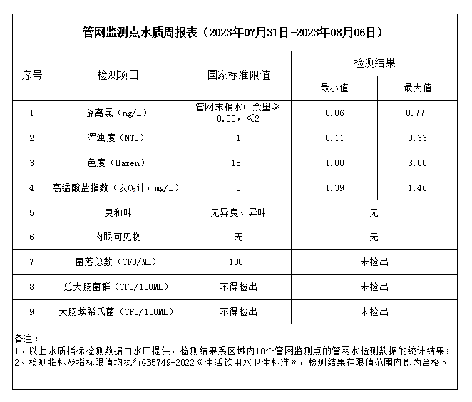 管網(wǎng)監(jiān)測點(diǎn)水質(zhì)周報(bào)表(2023年07月31日-2023年08月06日)