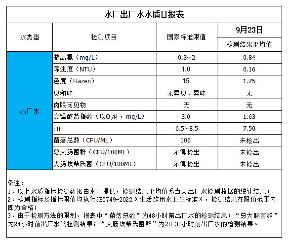 水廠出廠水水質(zhì)日報表(2023-9-23)