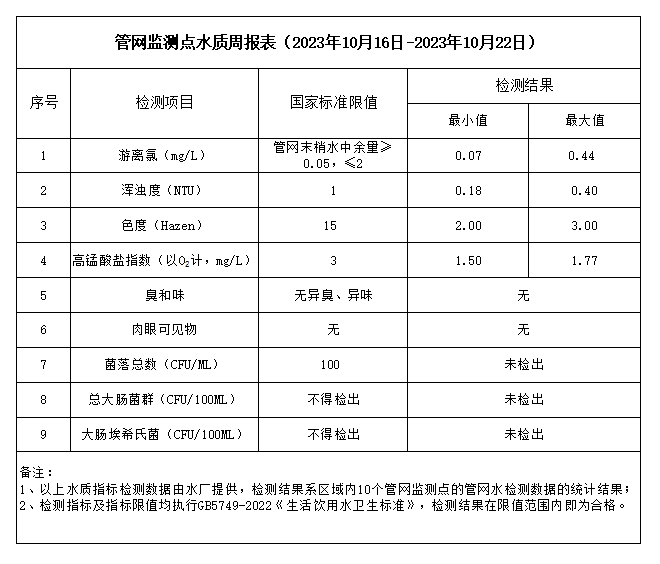 管網(wǎng)監(jiān)測(cè)點(diǎn)水質(zhì)周報(bào)表(2023年10月16日-2023年10月22日)