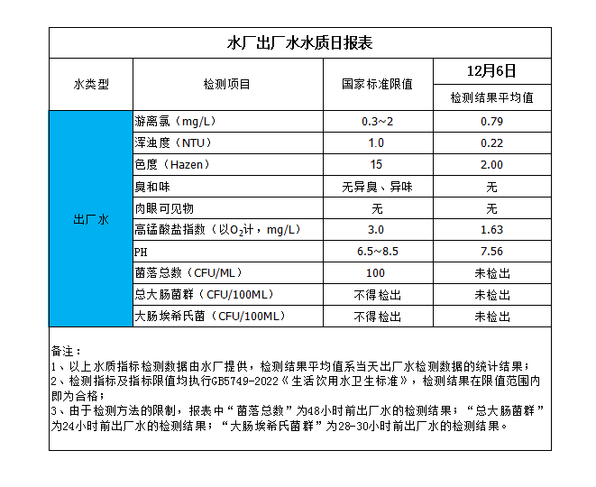 水廠出廠水水質(zhì)日?qǐng)?bào)表(2023-12-6)
