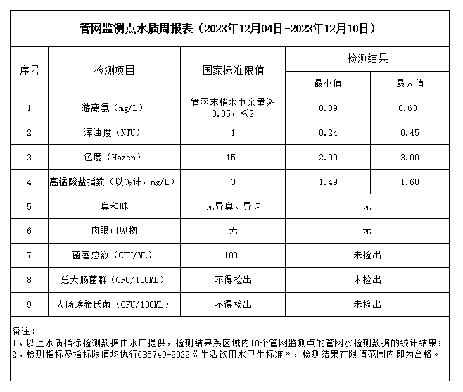 管網(wǎng)監(jiān)測點(diǎn)水質(zhì)周報(bào)表(2023年12月04日-2023年12月10日)
