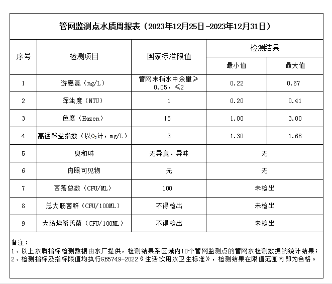 管網(wǎng)監(jiān)測點(diǎn)水質(zhì)周報(bào)表(2023年12月25日-2023年12月31日)