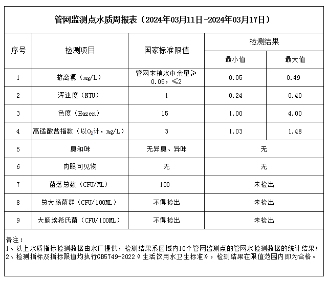 管網(wǎng)監(jiān)測點水質(zhì)周報表(2024年03月11日-2024年03月17日)