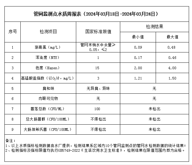 管網(wǎng)監(jiān)測(cè)點(diǎn)水質(zhì)周報(bào)表(2024年03月18日-2024年03月24日)