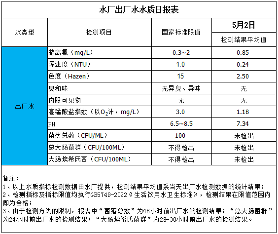水廠出廠水水質(zhì)日報表(2024-5-2)