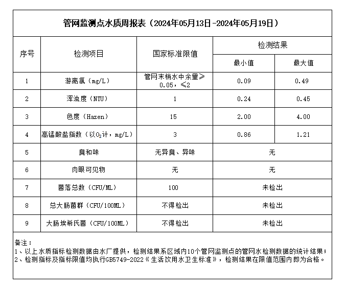 管網(wǎng)監(jiān)測(cè)點(diǎn)水質(zhì)周報(bào)表(2024年05月13日-2024年05月19日)