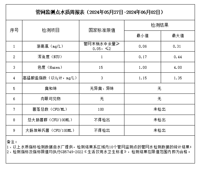 管網(wǎng)監(jiān)測(cè)點(diǎn)水質(zhì)周報(bào)表(2024年05月27日-2024年06月02日)