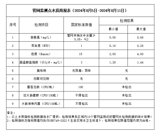 管網(wǎng)監(jiān)測(cè)點(diǎn)水質(zhì)周報(bào)表(2024年8月5日-2024年8月11日)