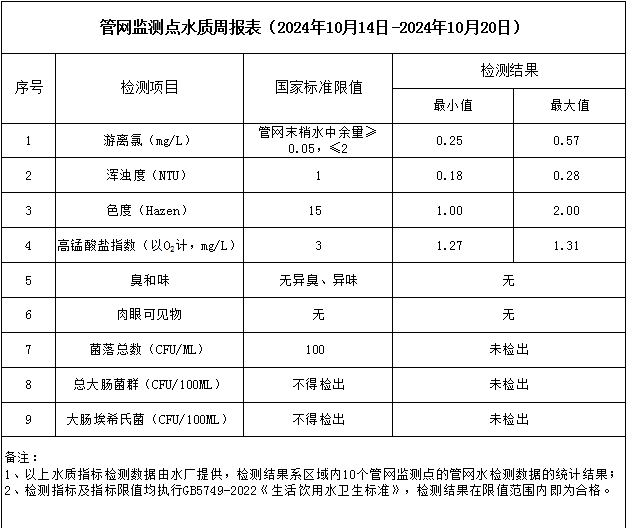 管網(wǎng)監(jiān)測點水質(zhì)周報表(2024年10月14日-2024年10月20日)