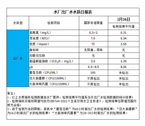 水廠出廠水水質(zhì)日報(bào)表(2025-1-16)
